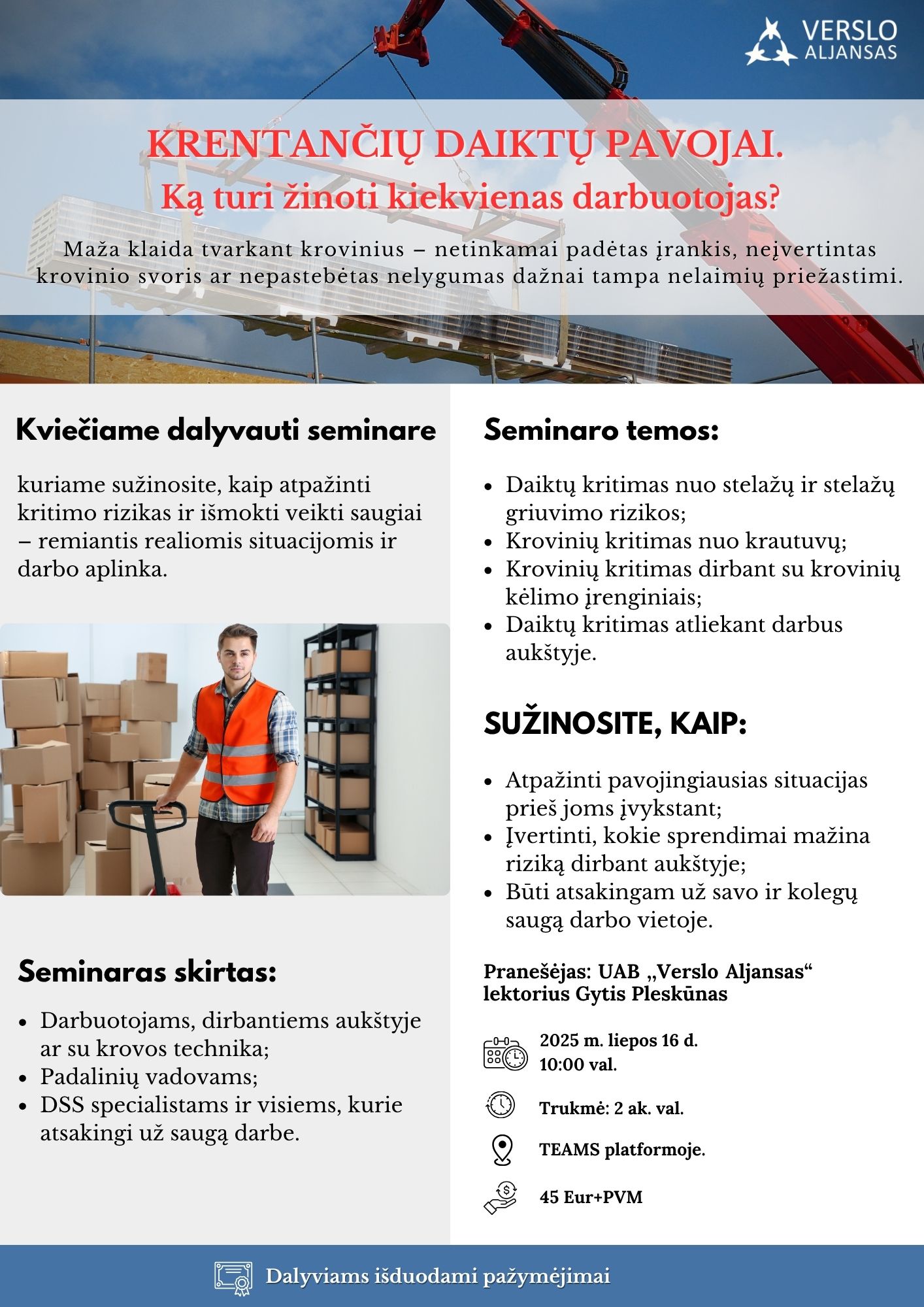 Seminare bus kalbama apie tai, kaip atpažinti kritimo rizikas ir užtikrinti saugų darbą – tiek dirbant aukštyje, tiek su krovinine technika. Tai ne tik profesinė atsakomybė, bet ir pagarba savo bei kolegų saugumui.
