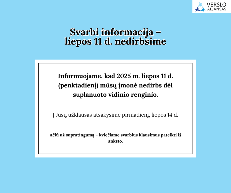 Informuojame, kad 2025 m. liepos 11 d. (penktadienį) mūsų įmonė nedirbs dėl suplanuoto vidinio renginio.