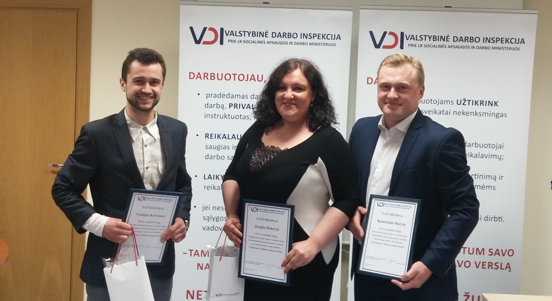 Pažymėjimus ir atminimo dovanėles nugalėtojams įteikė Lietuvos Respublikos vyriausiojo valstybinio darbo inspektoriaus pavaduotojas Arūnas Lupeika ir VDI komunikacijos skyriaus vyriausioji specialistė Nerita Šot.